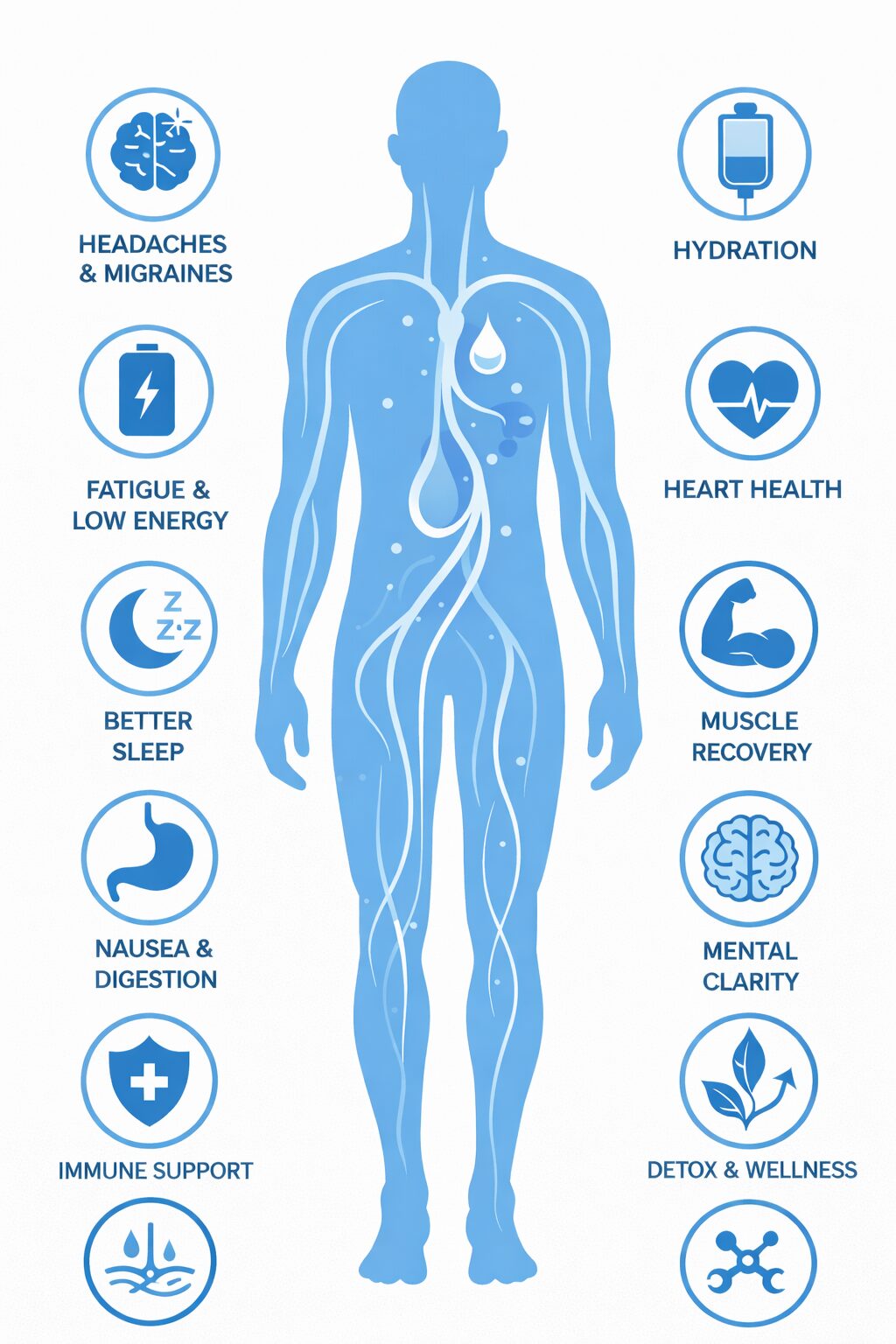 Hydrate your body, boost your energy, and support your health with IV therapy designed to help you feel your best. Simple support for energy, hydration, immunity, and recovery. IV therapy delivers fluids, vitamins, and nutrients directly into your bloodstream so your body can use them quickly.