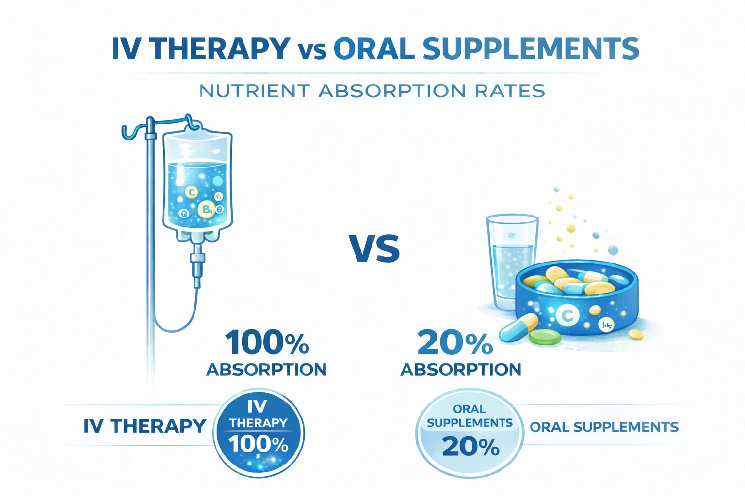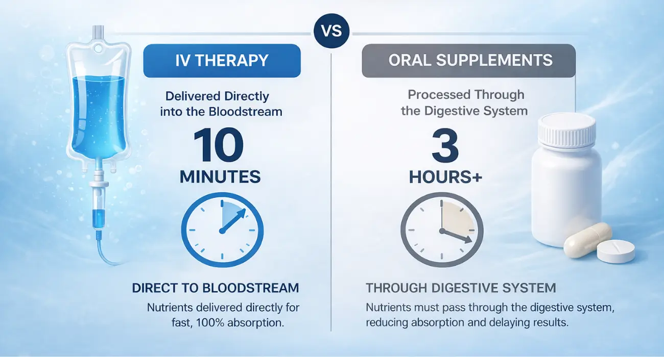 IV therapy delivers vitamins, minerals, and nutrients directly into the bloodstream, bypassing the digestive system completely. This allows for significantly higher absorption and immediate availability for the body to use. Because the nutrients circulate directly through the bloodstream, they can reach tissues more efficiently and support hydration, energy production, immune function, and overall recovery more effectively than many oral supplements.